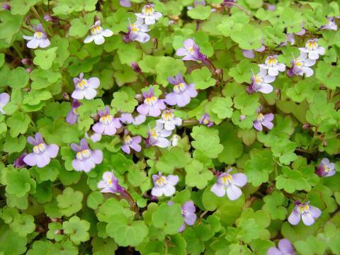 roots at nodes. Lilac-blue flowers. Brightens up areas beneath trees.